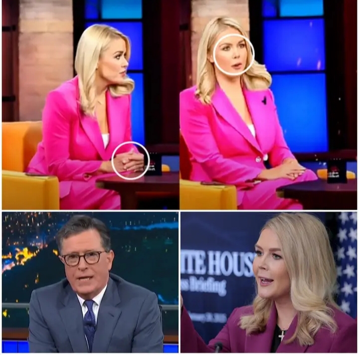 “She Came to Win the Spotlight — Instead, Stephen Colbert Turned It Into Her Worst Nightmare on Live TV” The clash no one expected exploded under the blinding studio lights when Karoline Leavitt stormed onto The Late Show armed with sharpened talking points and a smug grin, firing accusations like bullets while the crowd squirmed in nervous laughter —but Colbert, ice-cold and unshaken, let her unravel until the room went dead silent, and with a single line so lethal it felt like a televised execution, he flipped the script, crushed her confidence, and left her standing exposed shocking secret in front of millions, See the whole shocking truth here……